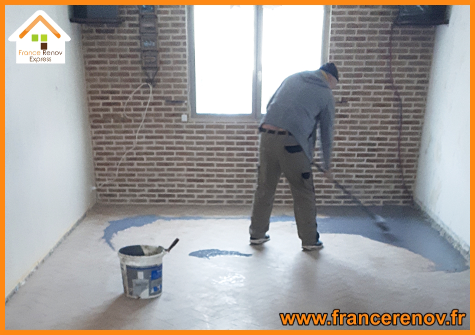 - Réalisation d'une chape pour mise à niveau avec le reste de la maison et pose d'un carrelage imitation parquet.