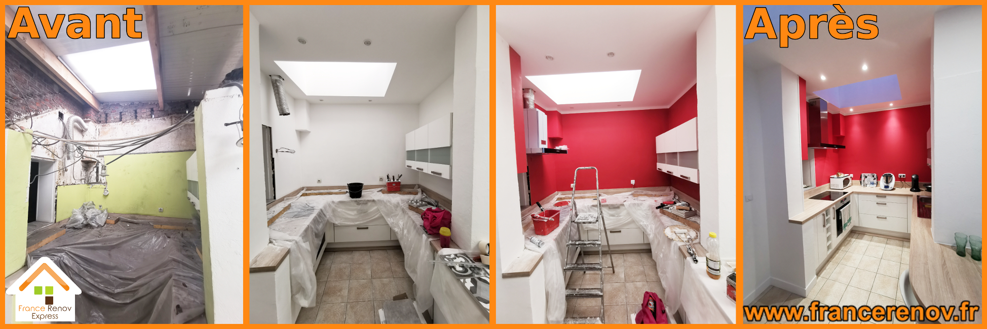 Rénovation complète d'une extension de maison: rénovation complète de la cuisine et de la salle de bain, modification de la toiture et installation d'une toiture bacacier isolée avec puits de lumière, rénovation de la façade avec un enduit gratté, changement de la porte-fenêtre, placos, plafonds, plomberie, électricité.