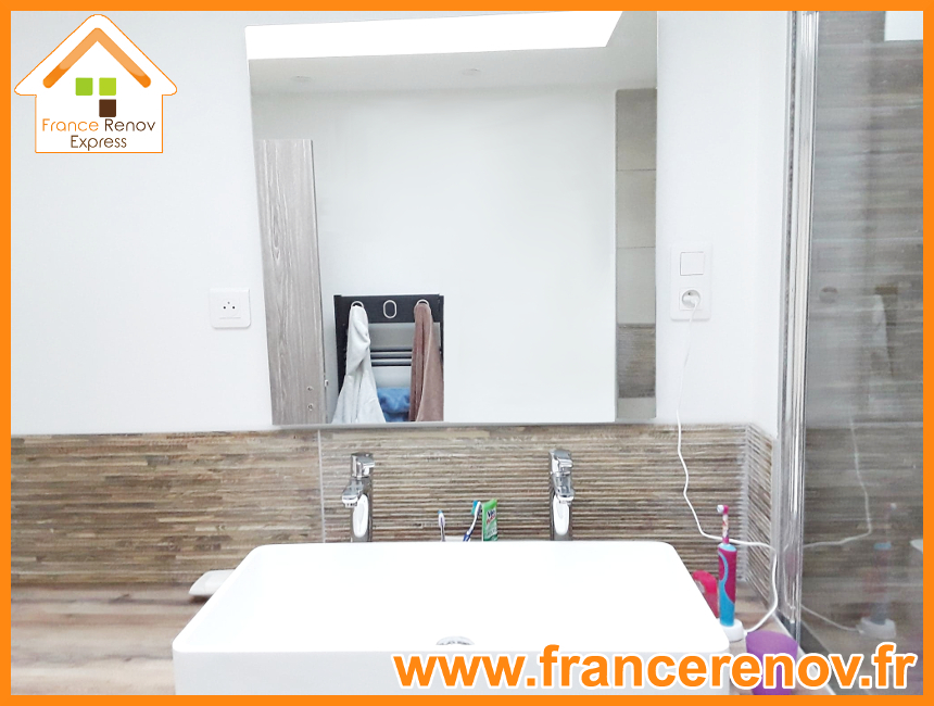 Rénovation complète d'une salle de bain France Rénov Express à Tressin: dépose complète de la salle de bain existante et de la toiture, verrière aluminium, baignoire douche avec paroi vitrée, faïence, carrelage, meuble vasque, sèche-serviette électrique, plâtrerie, plomberie, électricité.