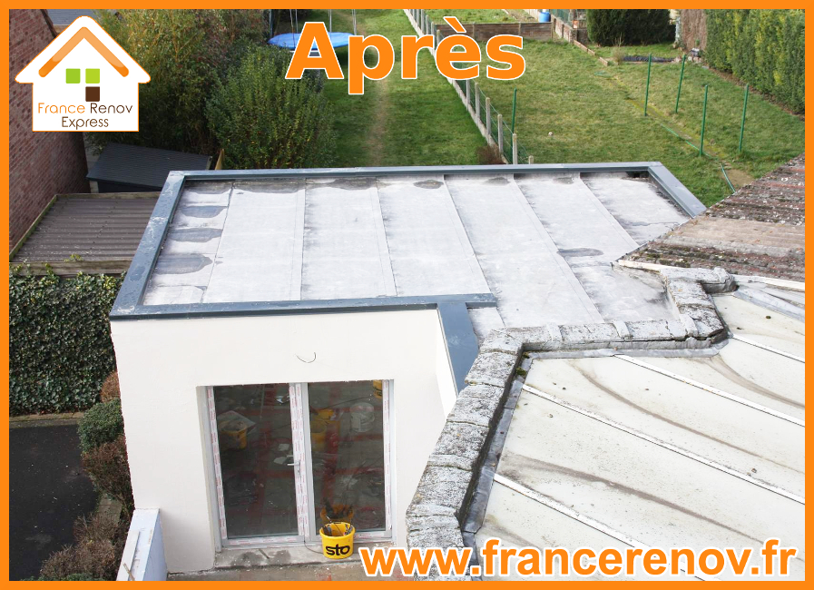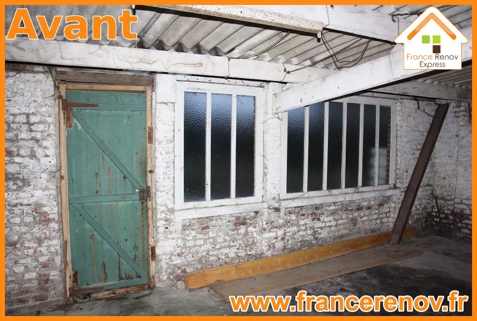 Transformation France Rénov Express d'une dépendance en extension de maison à Emmerin: dépose et évacuation de l'ancienne dépendance, dalle, création d'une toiture plate multicouches, création de 2 baies vitrées, façades enduit gratté, placos, plâtrerie, électricité. L'aménagement intérieur est réalisé par notre client.